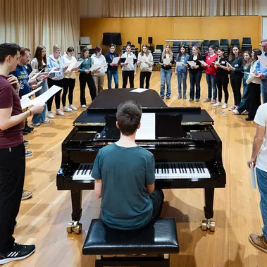 Nach den Themen „Wasser“ und „Pierre Boulez“ in den vergangenen Jahren widmete sich das „IM.PULS“-Projekt nun dem Schwerpunkt „Singen und Chorgesang“. Ein professionelles Vokalensemble hat über ein Jahr hinweg einen Schulchor begleitet. Gemeinsam haben die Schülerinnen und Schüler ein musikalisches Programm nach eigenen Ideen erarbeitet. Neben intensiven Proben gab es dabei Einblicke in den Musikerberuf. Nun können die jungen Sängerinnen und Sänger zeigen, was sie in diesem Jahr gelernt haben – auf der Festspielhaus- Bühne im öffentlichen Konzert beim „Mitsingfest“.