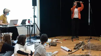 Auch für die angehenden Abiturientinnen und Abiturienten des Heisenberg-Gymnasiums aus Karlsruhe hatte Angéline verschiedene Aufgaben im Gepäck. So entstanden bereits in der ersten Probe interessante pantomimische Szenen, in denen die jungen Künstler ihre Mitschülerinnen und Mitschüler als Requisiten nutzten. So wurde manch Schüler auf der Bühne zum Tisch oder zu einer Leselampe. Mit Jans eigenem Vorstellungsvideo wurden die eigenen Beziehungen zu Oper erarbeitet.
