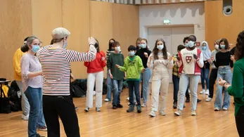 Am Tag nach dem großen Kennenlernen im Festspielhaus ging es für die Gruppe aus Frankreich direkt weiter. Was eine Theaterszene ausmacht, die nicht unbedingt geplant ist, lernten die Schülerinnen und Schüler mit Angéline. Theaterspielen in einer Sprache, die man nicht perfekt beherrscht? Welche besseren Voraussetzungen gibt es für Improvisationstheater? Mit Christian und Jans weiteren Videos ging es in den Kompositionsprozess. Wie entscheidend Musik die Wirkung von Bildern beeinflussen oder verändern kann, zeigte sich in einem kurzen Film, den Kleingruppen mit ihrer eigenen Musikauswahl unterlegen sollten. Danach wurden mit Tipps von Jan Kompositionen entwickelt, zu denen alle Jugendlichen etwas beigesteuert hatten und die vielleicht den Weg in die Premiere im Juni nächsten Jahres finden.