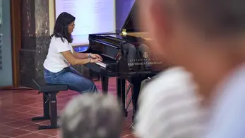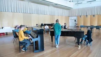 Bei Vanessa sah die Arbeit in der Tendenzengruppe etwas anders aus. Hier wurde aktiv am eigenen Instrument gearbeitet – und zwar „in C“. Die Gruppe tastet sich mit dem Stück von Terry Riley in das Feld der freien Improvisation vor. Wie weit sie gehen und wozu improvisiert wird, erfahren wir am 18. Juni in der Trinkhalle Baden-Baden.