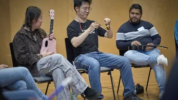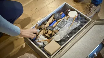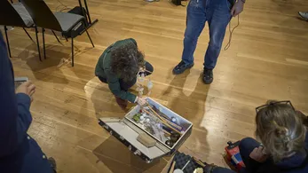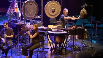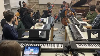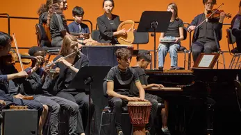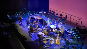In den vorherigen beiden Workshops hatten die Schülerinnen und Schüler sich bereits der Musik von Pierre Boulez angenähert, am 5. Februar stand dann das eigene Musizieren und die Notation davon im Vordergrund. Dabei kam ein ganzes Sammelsurium an (un)typischen Instrumenten zum Einsatz. Von Glocken bis hin zu einem Megaphon. Vorerfahrung brauchte es hierbei keine - nur Freude am Ausprobieren und eine Prise Kreativität bei der Suche nach (neuen) Klängen.