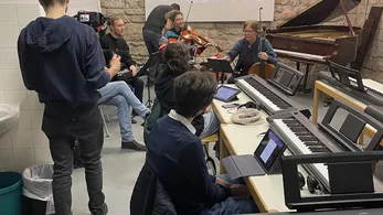 Nachdem das "Was" geklärt worden war, gab es professionelle Unterstützung für das "Wie". Die Musikerinnen und Musiker von Ensemble Recherche waren am 26. Februar bei Team Freiburg zu Gast und zeigten den Schülerinnen und Schülern, wie man mit modernen Spieltechniken Streichinstrumenten (neue) Klänge entlocken kann und welche besonderen Sounds mit einem präparierten Flügel erzeugt werden können.