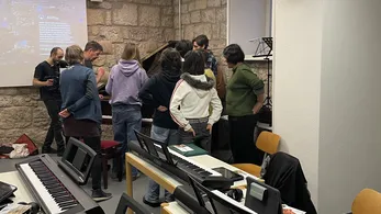 Zum Abschluss des Tages gab es noch einmal ein Zusammentreffen der beiden Projektteams. Beide Teams tauschten sich über ihre unterschiedlichen Arbeits- und Herangehensweisen aus und gaben kleine musikalische Einblicke in die Stücke, die sie gemeinsam mit ihren Coaches Veronika und Benjamin seit dem Projektstart im November komponiert haben.