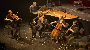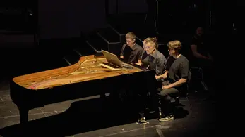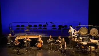 Richtig! Beim Abschlusskonzerts des Projekts treten sie alle gemeinsam auf der großen Bühne des Festspielhauses auf! Und für diesen Auftritt muss natürlich entsprechend geprobt werden. Während für die IM.PULS Klassen die "heiße" Probenphase erst im Juli beginnt, durfte das Ensemble Recherche, das zusammen mit den Komponistinnen und Komponisten die Jugendlichen des IM.PULS Projektjahrgangs 24/25 bei der künstlerischen Umsetzung ihrer Ideen unterstützt, im Rahmen der Pfingstfestspiele "Presence" schon reichlich Probenraumluft im Festspielhaus "schnuppern". Und für die IM.PULS Teams Karlsruhe und Baden-Baden bot sich bei ihrem Besuch im Festspielhaus am 6. Juni die einmalige Gelegenheit hautnah bei der Probe des Ensembles mit dabei zu sein.