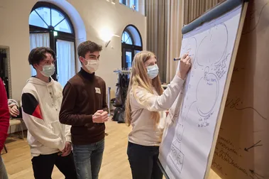 Bis zum nächsten gemeinsamen Treffen mit allen Beteiligten ist es noch ein wenig hin, aber es kann in der Zwischenzeit auch viel getan werden. Um die Themen und Umsetzungsmöglichkeiten zu konkretisieren, diskutieren die Schülerinnen und Schüler in ihren Kursen darüber, welche Idee letztlich verwirklicht werden soll.