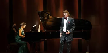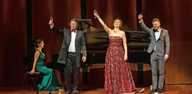 Kaum geprobt gelang das Besondere: Mit den ersten Tönen des Duetts „Tanzen möcht‘ ich“ aus der Operette „Die Csardaszfürstin“ zog stimmlicher Glanz ins Festspielhaus ein, der die aufgrund der aktuellen Landesverordnung 500 Besucher, oder, wie Benedikt Stampa das Publikum nannte, die "Happy Few" sogleich in Silvesterstimmung versetzte.