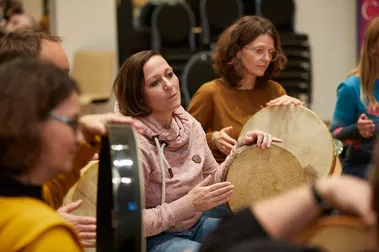 In seinem Impuls-Workshop „Vom Klassenzimmer nach Groovistan“ brachte Murat Coşkun Rhythmus, Stimme, Bewegung, Koordination und Percussion zusammen. Hierfür benützt er seine eigene Methode, die er speziell für Rhythmen in ungeraden Metren entwickelt hat. Diese Grooves und Sounds überträgt er zusammen mit Bewegung und Stimme auf die Rahmentrommel. Im Workshop wurde mit einer vereinfachten Technik gespielt, und die Teilnehmenden hatten so einen einfachen Zugang zu diesem „etwas anderen Feeling“ von Musizieren und konnten die Elemente auszuprobieren, erleben und soweit verinnerlichen, dass sie sie dann auch im Schulalltag weitervermitteln können.