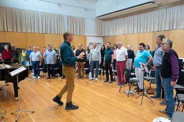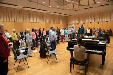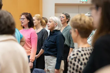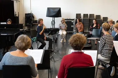 Der Einladung zum Deutsch-französischen Sing-Fest „VIVE LE GESANG“ sind rund 60 Teilnehmerinnen und Teilnehmer gefolgt. An den beiden Workshoptagen am 29. und 30. Oktober arbeiteten die Singbegeisterten an den Werken, die am 12.11 um 14 Uhr beim kostenfreien Abschlusskonzert im Festspielhaus zu hören sein werden. Der Projektchor wird (auch stimmlich) unterstützt von Mitgliedern des Balthasar-Neumann-Chors und präsentiert eine Mischung aus deutsch-französischen Stücken, unter anderem von Johannes Brahms und Francis Poulenc.